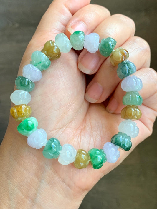 Premium Natural Grade A Icy Translucent Gelatinous Multicolored Jade Jadeite Lotus Flower Beads Beaded Bracelet 7” 36g 天然冰胶多宝翡翠莲花珠手串 MYL980