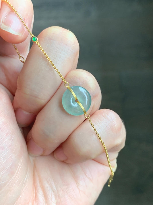 Certified Natural Grade A Icy Translucent Light Green Jade Jadeite Ping An Kou Donut 18K Yellow Gold Bracelet 6.25-6.75” 天然冰晴绿翡翠平安扣镶嵌手链 9461