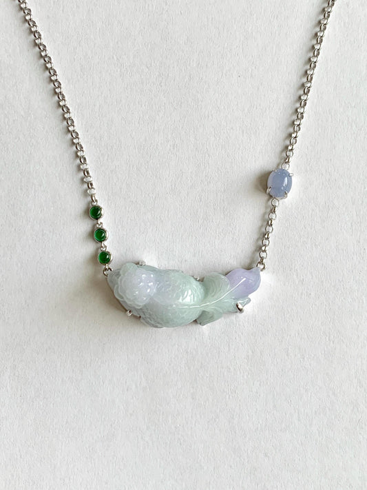 Certified Natural Grade A Icy Translucent Pastel Green Purple Jade Jadeite Goldfish Pendant Necklace Sterling Silver 16.5" 天然冰春彩翡翠金鱼锁骨链 172