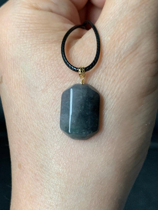 Natural Icy Translucent Wuji Jadeite Emerald Cut Faceted Pendant with 18K Yellow Gold Bail 天然冰乌鸡翡翠切割面镶嵌吊坠
