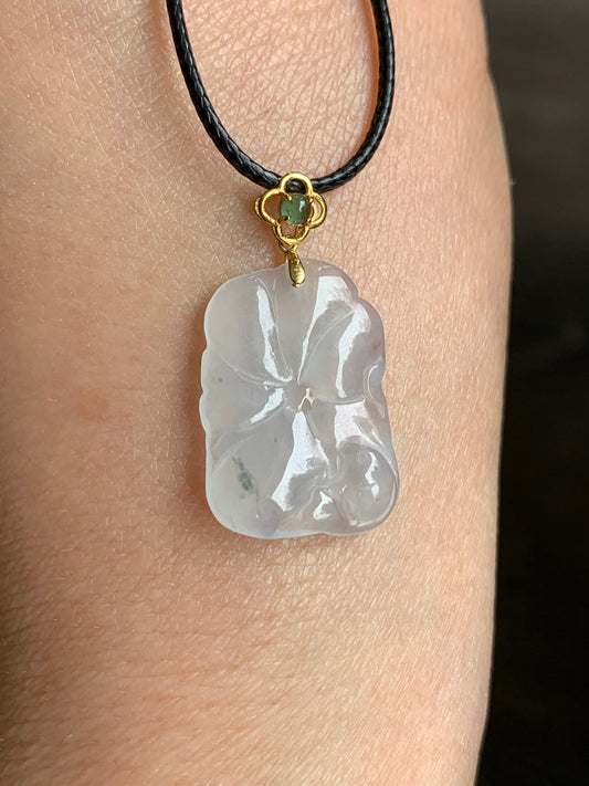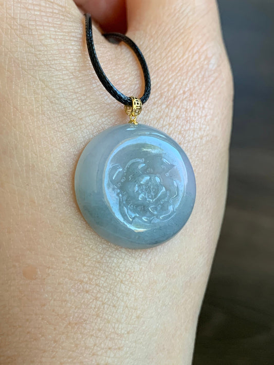 Natural Translucent Icy Wuji Marbled Jadeite Carved Peony Flower Coin Pendant 18K Yellow Gold Bail 天然糯冰淡紫乌鸡翡翠牡丹花圆牌吊坠