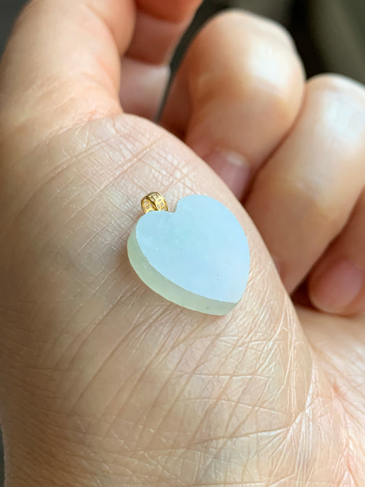 Natural Highly Translucent Icy Light Green Jadeite w/ White Marbling Heart Pendant 18K Yellow Gold Bail 17” Cord 天然冰晴莫西沙翡翠爱心镶嵌吊