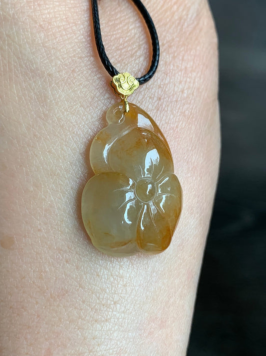 Natural A Graded Icy Translucent Rich Yellow Marbled Jadeite Carved Lily Pad Pendant 18K Yellow Gold Bail 天然冰黄翡荷叶镶嵌吊坠