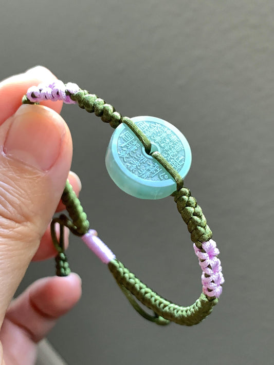 Natural Grade A Guatemalan Icy Translucent Light Teal Green Jadeite Mountain Ghost Eight Trigrams Coin Rope Bracelet 天然冰危浅蓝绿翡翠山鬼护身符手绳 SGS105