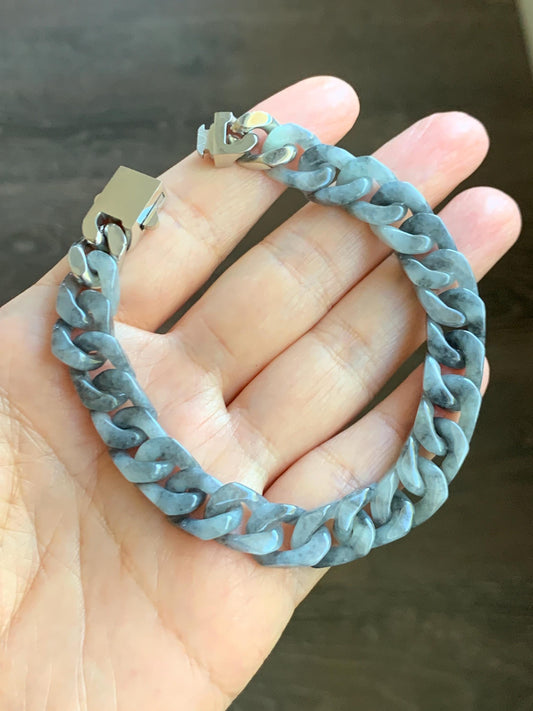 Certified Natural Grade A Icy Translucent Wuji Jade Jadeite Carved Curb Link Chain Bracelet Stainless Steel 7.5” 22g 天然冰乌鸡翡翠古巴链手链 750