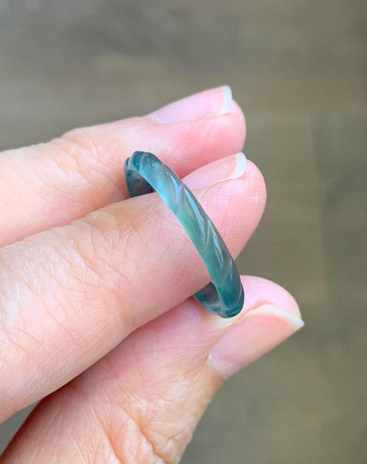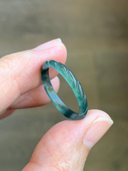 Natural Grade A Guatemalan Icy Highly Translucent Dark Teal Green Jade Jadeite Carved Braid Band Ring Size 9 US 天然冰危深蓝绿翡翠麻花戒圈 MHJ55B