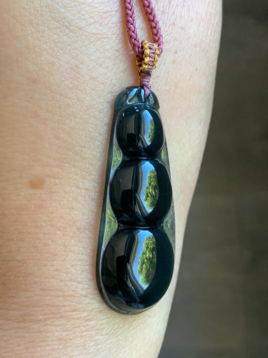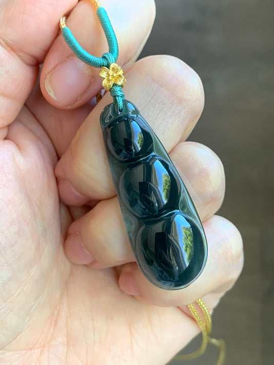 Natural Guatemalan Icy Translucent Dark Wuji Jadeite Large Peapod Pendant Rope Necklace 26” Adjustable 8g 天然冰危乌鸡翡翠福豆吊坠