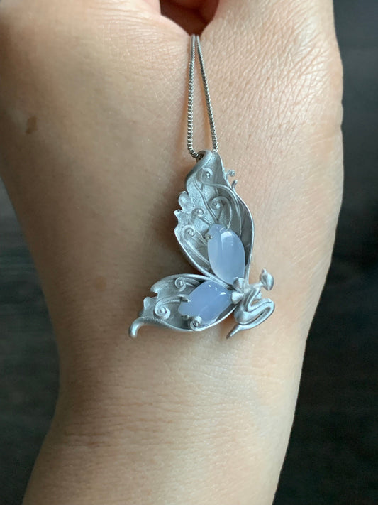 Certified Natural Icy Translucent Light Lavender Jadeite Butterfly Fairy Custom Design Pendant Sterling Silver 天然冰淡紫翡翠蝴蝶仙子镶嵌吊坠