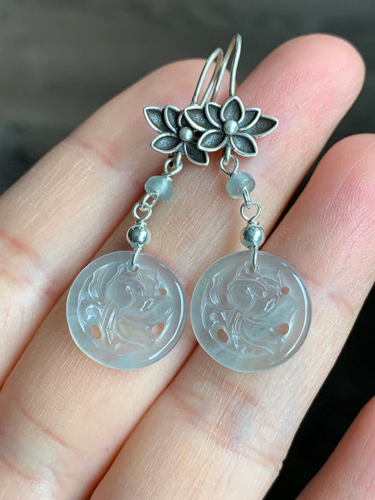 Stunning Natural Guatemalan Icy Highly Translucent Light Blue Jadeite Lotus Flower Dangle Earrings S925 Sterling Silver 天然冰危天空蓝翡翠莲花银耳钩