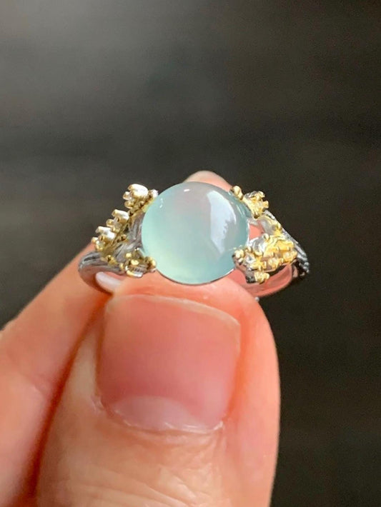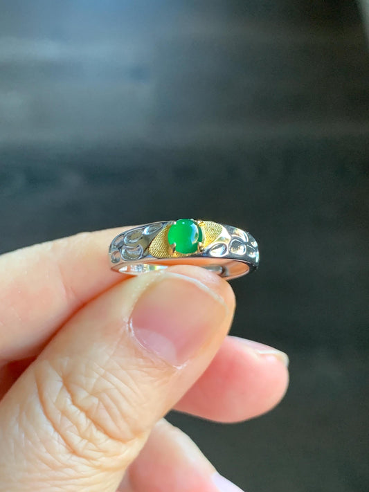 Natural Guatemalan Icy Translucent Vibrant Green Round Jadeite Band Style Ring Two-tone Sterling Silver Size 7 Adjustable 天然冰危绿翡翠银镶戒指 TTB55