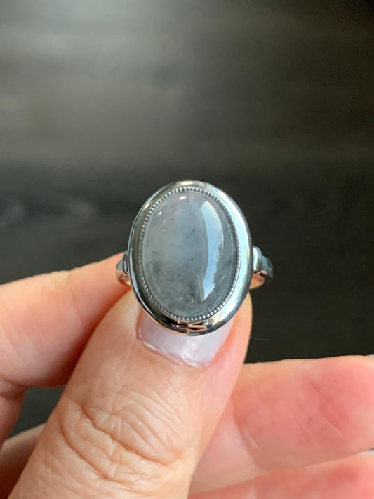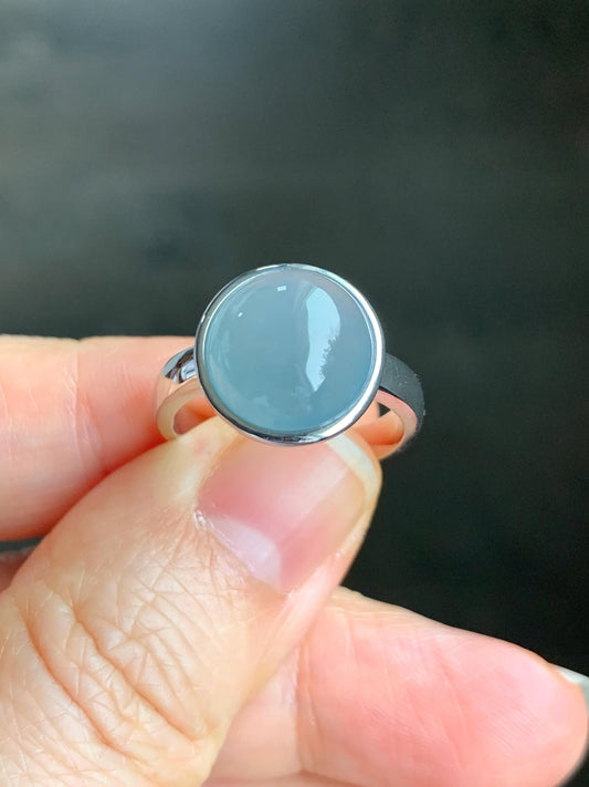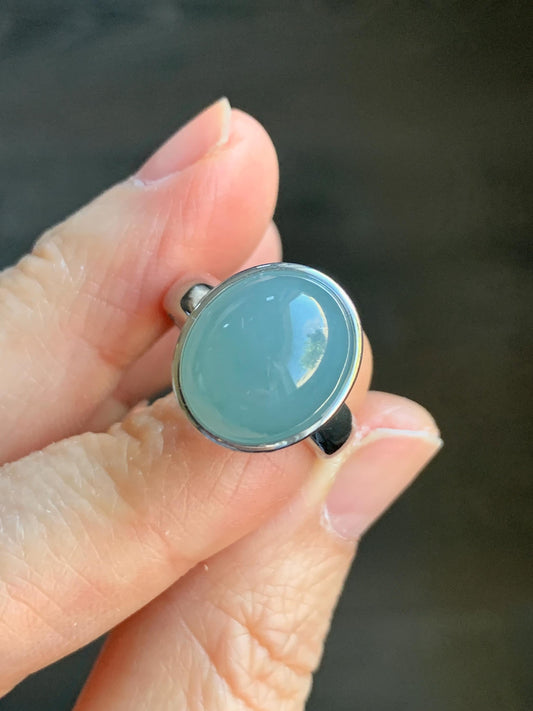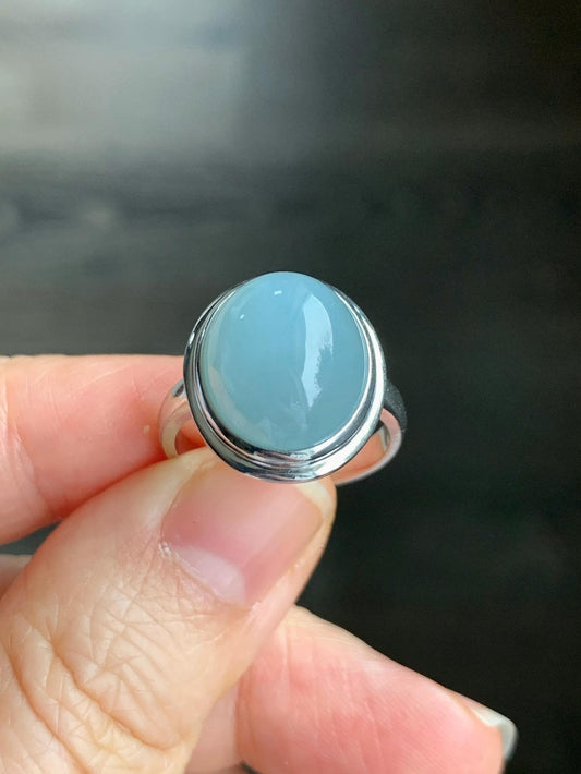 Certified Natural Guatemalan Icy Translucent Dusty Light Blue Jadeite Large Oval Ring Sterling Silver size 7 US 4.99g 天然冰胶危浅蓝翡翠镶嵌戒指 7390