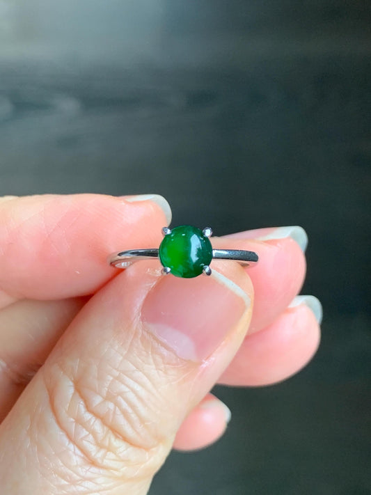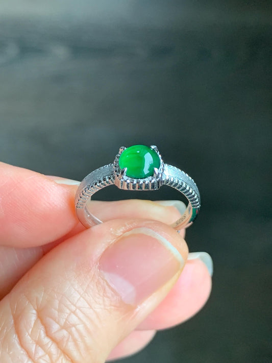 Natural Guatemalan Grade A Icy Translucent Vibrant Green Jadeite Solitaire Band Style Ring Sterling Silver Size Adjustable 天然冰危绿翡翠银镶戒指 BRL60