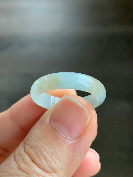 Natural Grade A Icy Translucent Bicolored Pastel Blue Golden Yellow Marbled Jadeite Band Ring Size 8.5 US 天然冰胶浅蓝撒金翡翠戒圈 SHS66