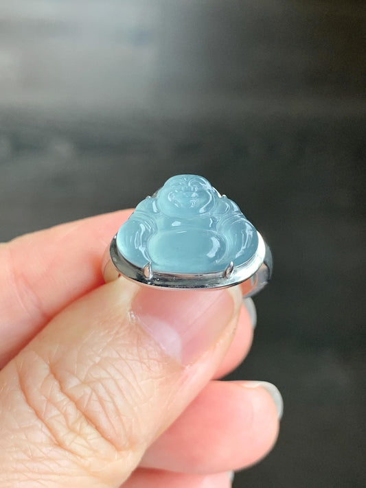 Certified Natural Guatemalan Icy Highly Translucent Light Teal Blue Jadeite Buddha Ring Sterling Silver Size 7 US 5.79g 天然冰危浅蓝起光翡翠佛公戒指 1680