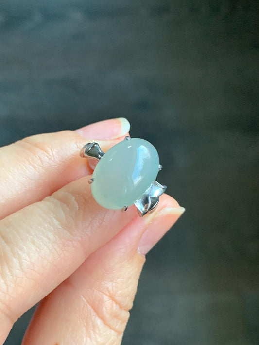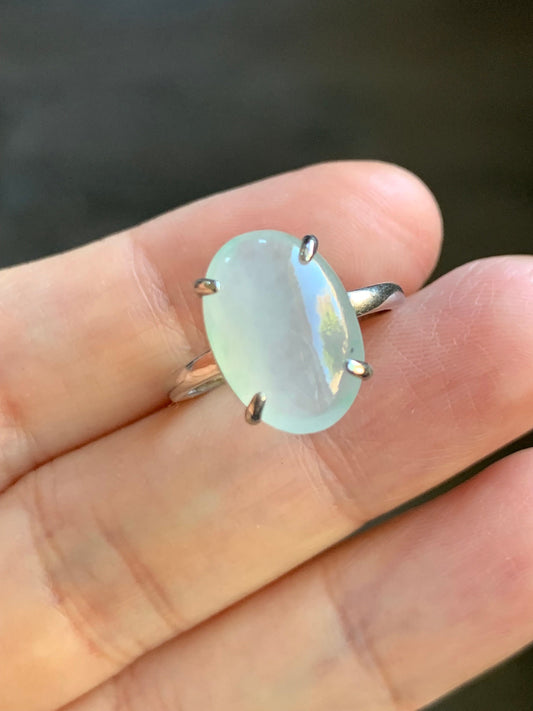 Large Natural Icy Translucent Gelatinous White Oval Jadeite Green Marbling Solitaire Ring Sterling Silver 天然冰胶白冰翡翠蛋面银镶戒指 MB100