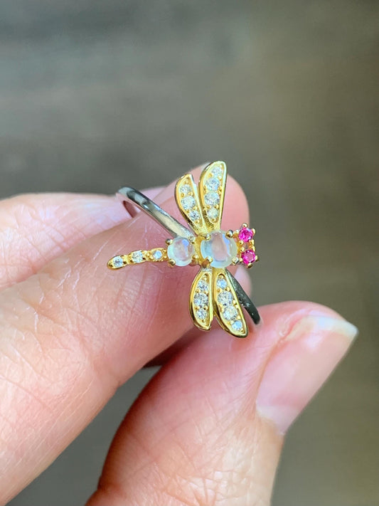 Natural Icy Highly Translucent White Jadeite Dragonfly Design Ring S925 Sterling Silver Sz 7 Adjustable 天然白冰翡翠蜻蜓银镶戒指 MQT60