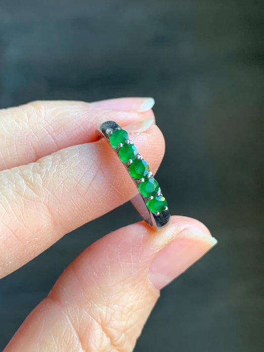 Certified Natural Guatemalan Icy Translucent Vibrant Green 5-Stone Jadeite Diamond Faceted Band Ring Size 7.25 Sterling Silver 天然冰危绿钻石翡翠镶嵌排戒