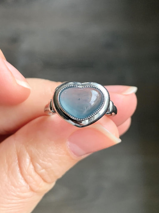 Certified Natural Guatemalan Icy Highly Translucent Blue Jadeite Heart Ring Sterling Silver size 7 3.35g 天然冰胶危蓝翡翠爱心镶嵌戒指 7405