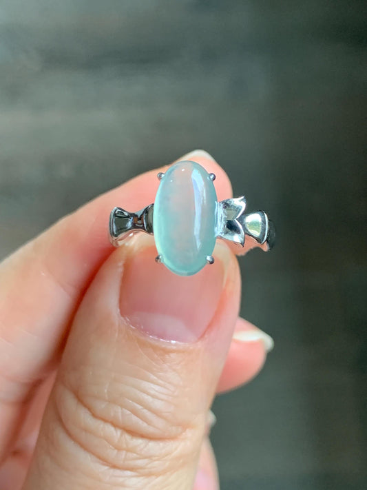 Certified Natural Icy Highly Translucent Pastel Green Oval Jadeite Bamboo Ring Sterling Silver size 6.5 天然冰胶起光晴底翡翠镶嵌竹节款戒指 7396