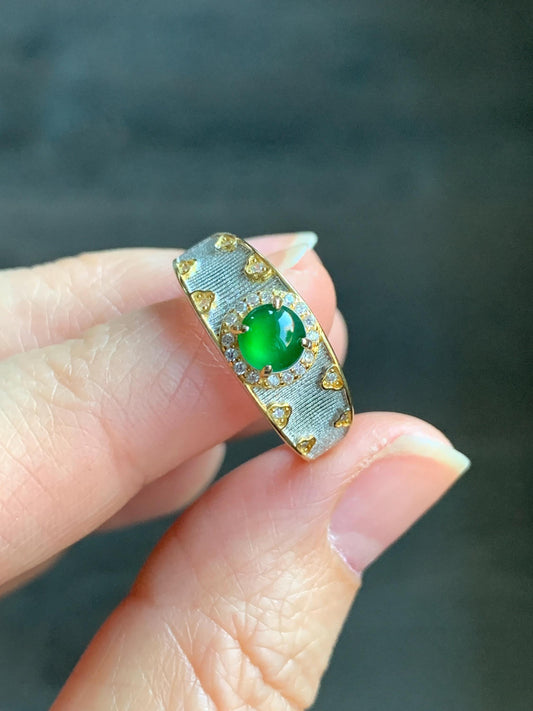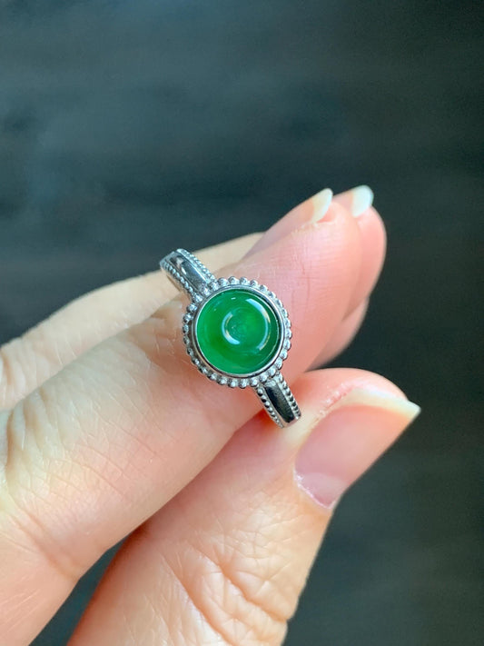 Natural Guatemalan Icy Translucent Vibrant Green Round Jadeite Band Style Ring S925 Sterling Silver Size 7 Adjustable 天然冰危绿翡翠银镶戒指 MLR120