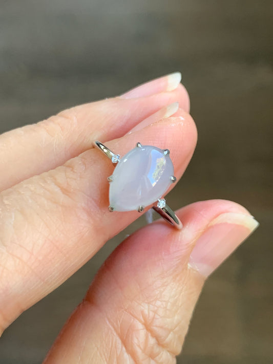 Certified Natural Icy Translucent Gelatinous White Jadeite Teardrop Ring 18K White Gold and Diamonds size 7 天然白冰胶翡翠水滴镶嵌戒指 1690
