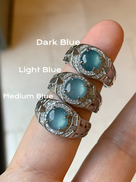 Large Natural Guatemalan Icy Highly Translucent Blue Jadeite Band Ring S925 Sterling Silver Size 9.5 Adjustable 天然老种冰蓝危地马拉翡翠宽版银镶戒指 WNJ90