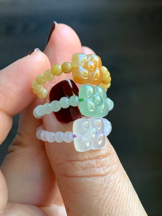 Natural Icy Translucent Light Green, Yellow Or White Jadeite Flower Petite Beads Beaded Band Ring Stretchy Size Varies 天然翡翠花小米珠戒圈