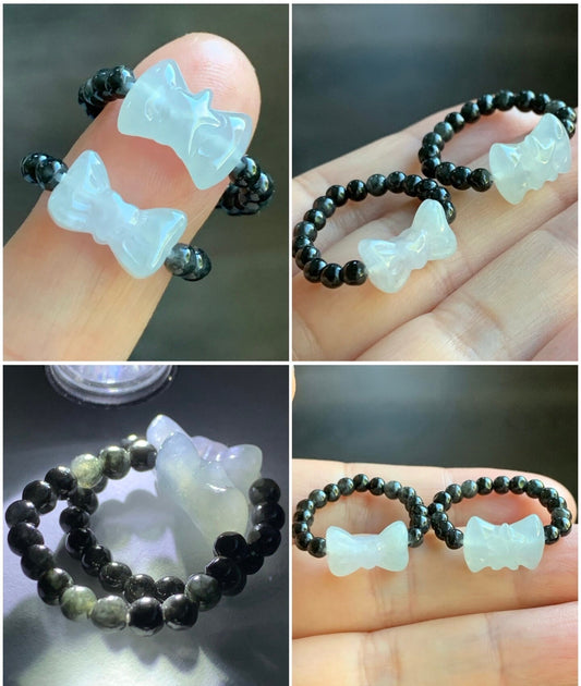 Natural Icy Translucent Gelatinous White Jadeite Bow Dark Wuji Jadeite Petite Beads Beaded Ring Stretchy 天然白冰起光翡翠蝴蝶结乌鸡翡翠戒圈