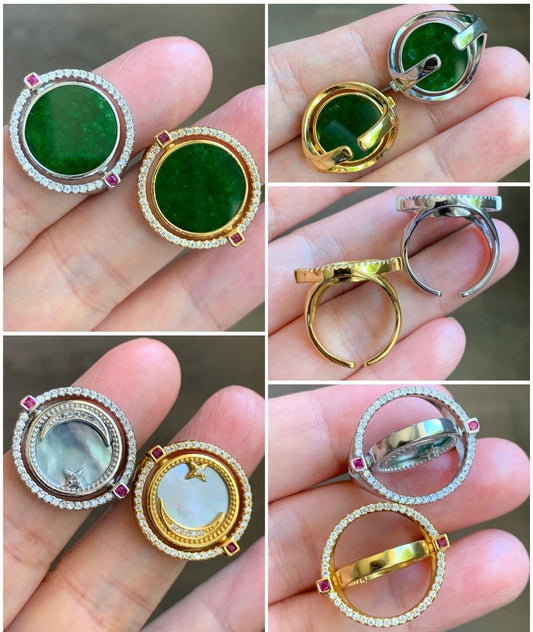 Natural Grade A Icy Translucent Vibrant Green Jadeite MOP Flip Ring Sterling Silver Size 6 Adjustable 6g 天然阳绿花青翡翠贝母双面银镶戒指 HQY200