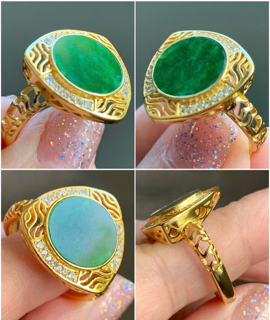 Natural Grade A Icy Translucent Vibrant Green Jadeite Triangle Ring S925 Sterling Silver Size 8 Adjustable 5g 天然阳绿花青翡翠银镶戒指 HQ150
