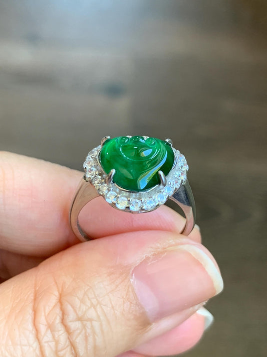 Natural Guatemalan Icy Translucent Vibrant Green Jadeite Ruyi Ring Halo Style Sterling Silver Size 7 Adjustable 天然老种冰危绿翡翠如意银镶戒指