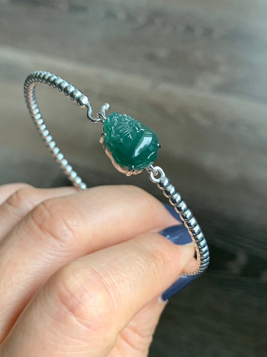 Certified Natural Guatemalan Grade A Icy Dark Teal Jadeite 3-Legged Toad Bangle Bracelet Sterling Silver Custom Design 天然冰蓝水翡翠三脚金蟾银镶手镯 2698