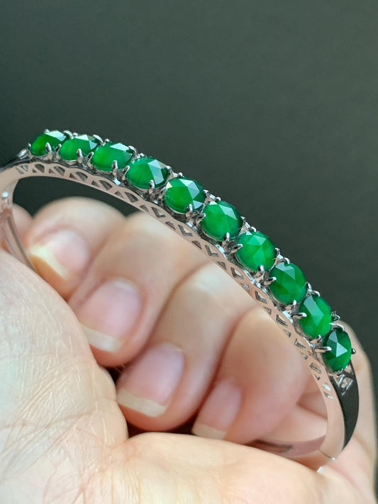 Natural Guatemalan Icy Translucent Vibrant Green Faceted Jadeite 10-Stone Bangle Bracelet Sterling Silver w/ Clasp 9g 天然冰危绿切割面翡翠银镶手镯 QGB560