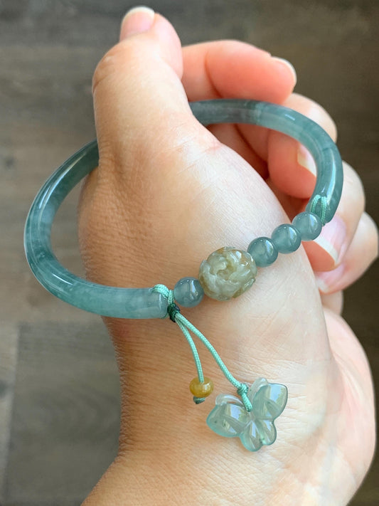 Natural Grade A Guatemalan Icy Highly Translucent Light Blue Marbled Jadeite Open Bangle Bracelet w/ Charms 59.8mm 19g 天然冰胶危浅蓝飘花翡翠半镯 WLP178