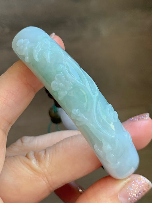 Natural Icy Translucent Gelatinous Green Marbled Jadeite Half Bangle Bamboo & Cherry Blossom Rope Bracelet 46.5mm 天然冰胶飘花翡翠半镯竹节梅花手绳
