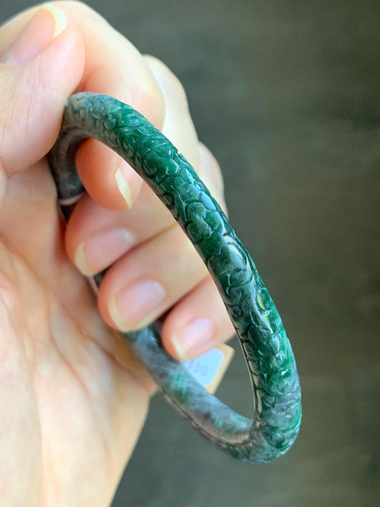 Certified Natural Translucent Wuji & Green Marbled Jadeite Engraved Bangle Pendant Set 56.7mm 天然乌鸡飘绿花翡翠雕花手镯镯心吊坠