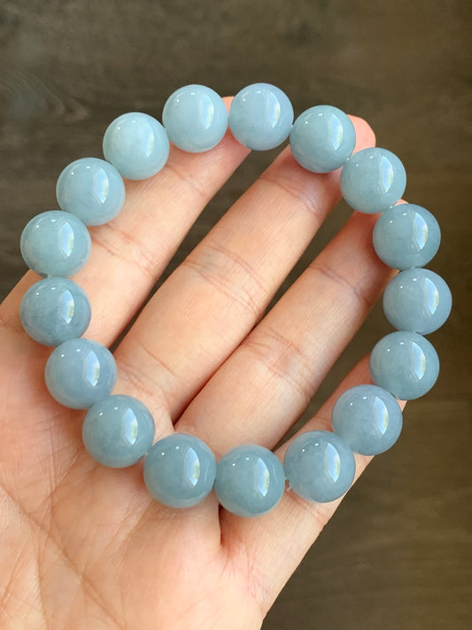 Certified Natural Grade A Icy Translucent Dusty Light Blue Jadeite Large Beaded Bracelet 12.3mm 7.75” 54g 7851