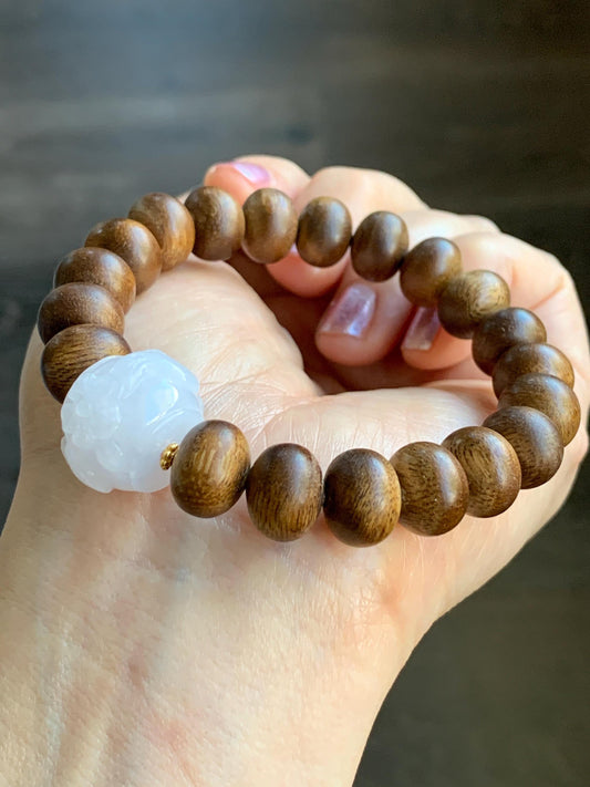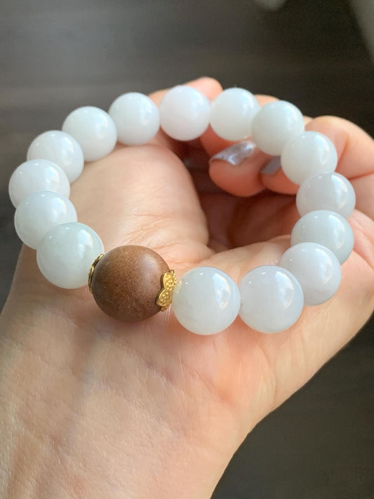 Large Natural Icy Translucent White Jadeite Beads Laoshan Sandalwood Beaded Bracelet Sterling Silver 12.5mm 7.25” 52g 天然白冰翡翠大珠手串