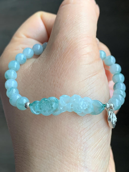 Natural Grade A Icy Translucent Gelatinous Teal Green Marbled Jadeite Lotus Flower Beaded Bracelet Sterling Silver 6.5" 9g 天然冰飘花翡翠莲花圆珠手串