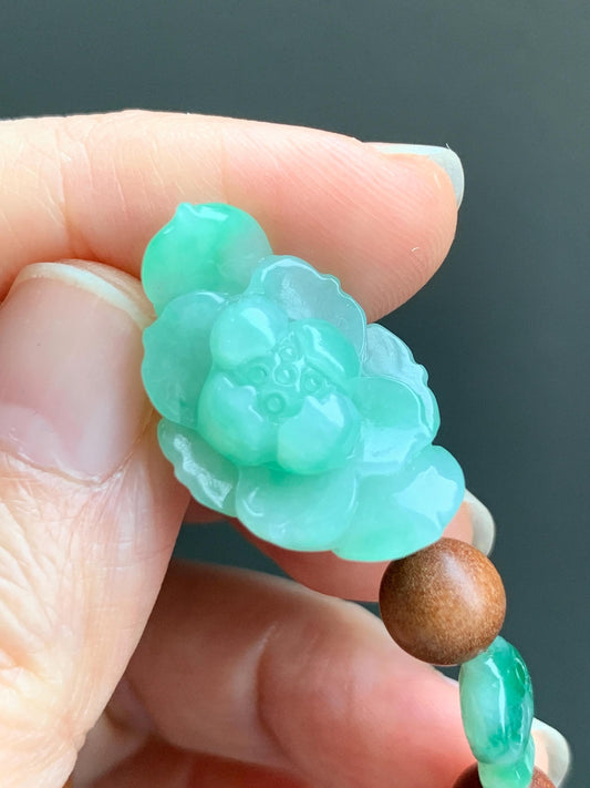 Natural Grade A Icy Translucent Apple Green Jadeite Lotus Flower Barrel Bead Fish Charm Wood Beads Beaded Bracelet 6.5” 12g 天然冰果绿翡翠莲花木珠手串
