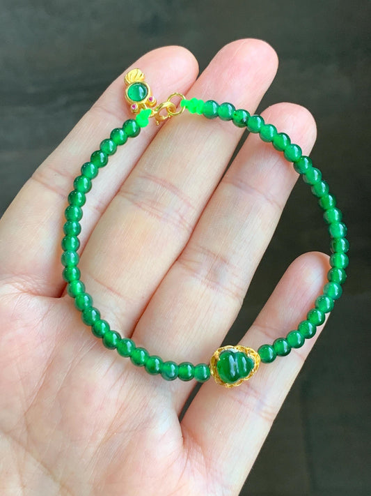 Natural Guatemalan Icy Translucent Vibrant Green Jadeite Beads Gourd Goldfish Charms Beaded Bracelet Sterling Silver 6.75” 天然冰危绿翡翠葫芦小圆珠手串