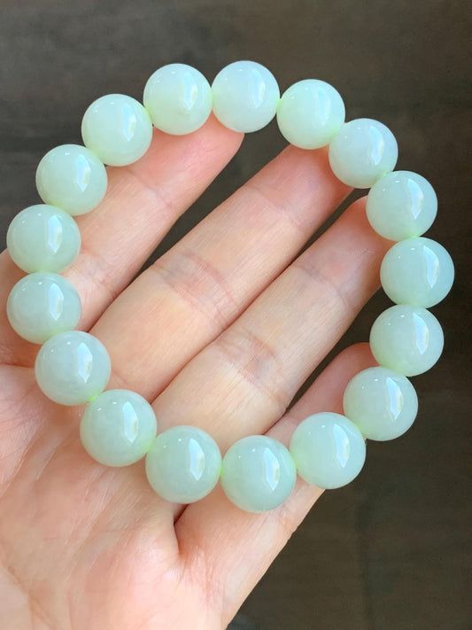 Natural Grade A Icy Translucent Light Beige Jadeite Large Round Beads Beaded Bracelet 12mm 7.25” 51g 天然冰糖雪梨黄翡翠圆珠手串 DBT468