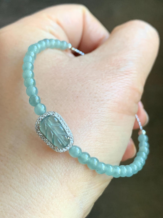 Natural Guatemalan Icy Translucent Light Teal Blue Jadeite Leaf Charm & Petite Beads Wire Bracelet Sterling Silver 6.5”-7.5” 天然冰危浅蓝翡翠叶子珠银手串