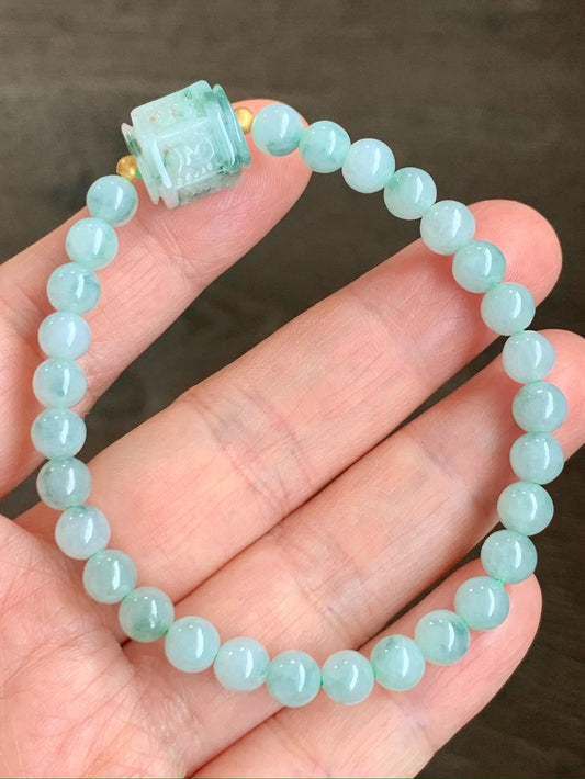Natural Grade A Icy Translucent Green Marbled Jadeite Jadeite Engraved Six Word Mantra Hexagon Bead Beaded Bracelet 6.75” 天然冰飘绿花翡翠六字真言珠圆珠手串