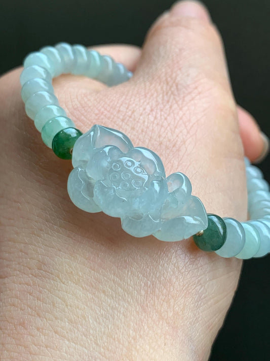 Certified Natural Grade A Icy Highly Translucent Gelatinous Light Green Jadeite Lotus Flower Beaded Bracelet 6.75" 15g 天然冰胶晴色翡翠莲花算盘珠手串 6922