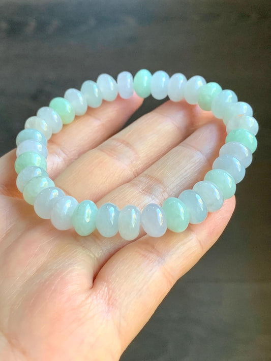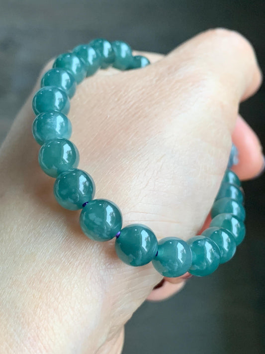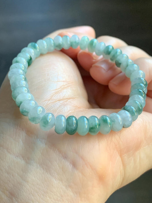 Natural Icy Translucent Light Green Teal Green Marbled Jadeite Drum Beads Beaded Bracelet Stretchy 6” 15g 天然冰胶晴色飘花翡翠鼓珠手串 SH919