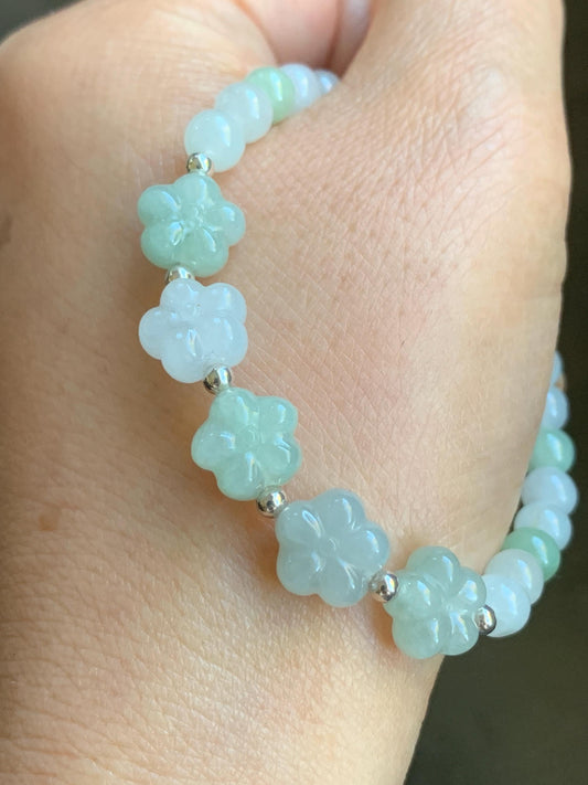 Natural Icy Translucent Light Green & White Jadeite Chery Blossom Beaded Bracelet Sterling Silver 6.75” 12g 天然白冰晴底翡翠梅花圆珠手串
