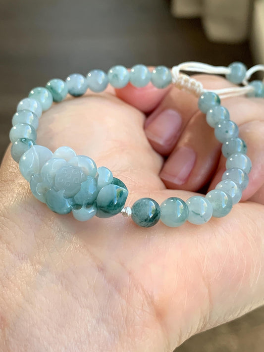 Certified Natural Icy Translucent Teal Green Marbled Jadeite Lotus Flower Guatemalan Jadeite Beaded Bracelet 6.75” 天然冰飘花翡翠莲花圆珠手串