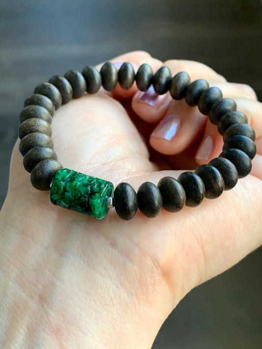 Natural Semi Translucent Vibrant Green Marbled Jadeite Engraved Barrel Bead Agarwood Beaded Bracelet 7.25” 10g 天然辣绿飘花翡翠仿古雕桶珠沉香鼓珠手串