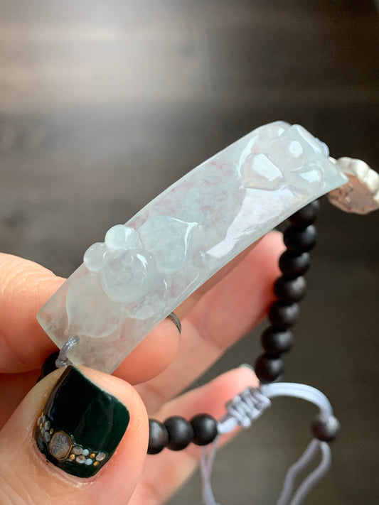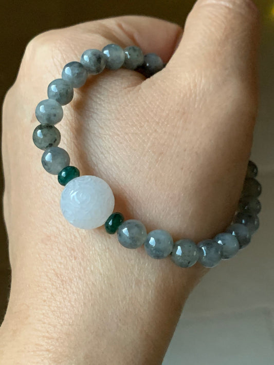 Natural Grade A Icy Translucent Gelatinous Wuji Jadeite Beads and White Jadeite Engraved Bead Beaded Bracelet 6.75" 天然冰胶乌鸡翡翠仿古雕珠手串